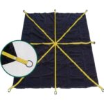Made from super strong 40 oz./sq. yd. black vinyl coated fabric. Sewn with a crisscross and plus pattern. 2″ yellow high strength webbing with 3″ id x 3/8″ heavy steel O-rings sewn to ends of webbing. A great tarp for lifting debris from roofs and construction sites, simply load the tarp with debris, attach a clevis hook to the steel rings and lift. CAUTION: Not to be used as a lifting sling. Always be sure that no personnel are under any materials being lifted. Watch for any wear points in the tear off tarp. If wear points are visible, do not use the tarp, replace it immediately.