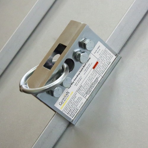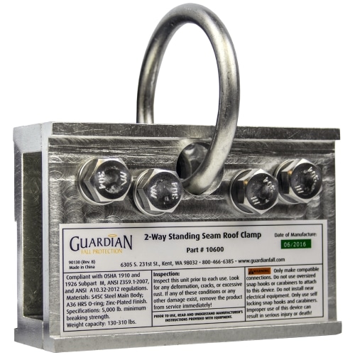 The Guardian Fall Protection Two-Way Universal Standing Seam Clamp is lightweight, reusable, and easy-to-use. This product possesses an all steel construction with zinc electroplate finish making it very durable. The clamp also features a unique, reversible design that allows for seams up to 1-inch wide. The MR-24, VSR or similar profiles can be covered with one clamp.
