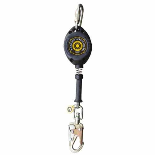 The Guardian Fall Protection “Yellow Jacket Cable Retractable” is a lifeline system that offers a compact and lightweight design. The Yellow Jacket Retractable has been machined and fabricated specifically to reduce the weight of the retractable, making it small and compact making it easier to handle. This product is composed of stainless steel and non-corrosive internal components that are protected via its durable ABS reinforced housing. The proprietary ABS housing is supported by an inside steel brace which increases the overall durability of this lightweight retractable. The retractable possesses a high strength composite cable guide and quick-action braking system, and so, meets or exceeds all OSHA and ANSI standards. The interior brake body is specifically designed to reduce the amount of debris that enters the braking mechanism and helps protect the deceleration components. This product comes with a swivel top and carabiner. This retractable lifeline is fully repairable and manufactured in the USA. The heavy duty version includes an attached shock pack.
