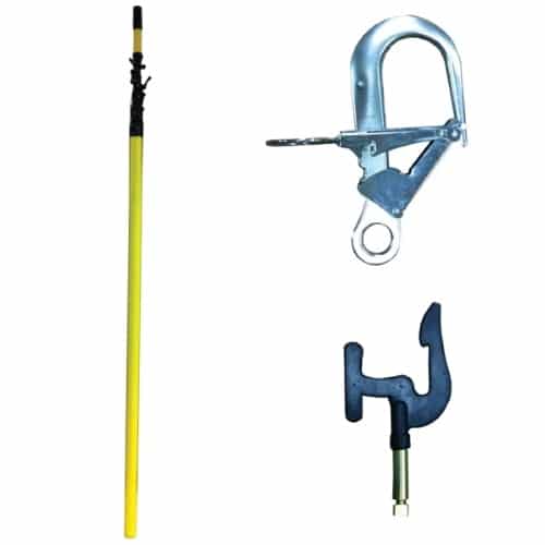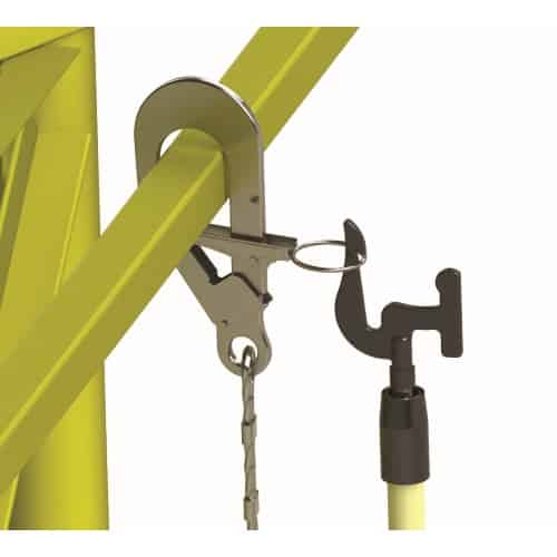 The Guardian Fall Protection Remote Anchor Connector connector functions to safely install an Anchorage Connector from ground level. Used in combination with a VLS or SRL (Sold Separately) The user connects their VLA or SRL to the system aluminum hook anchorage connector, then uses the system telescopic pole to raise the aluminum hook anchorage connector up to a compatible structural anchor point. The user then connects their full body harness to the VLA or SRL, and can climb up to the work surface while fully protected.