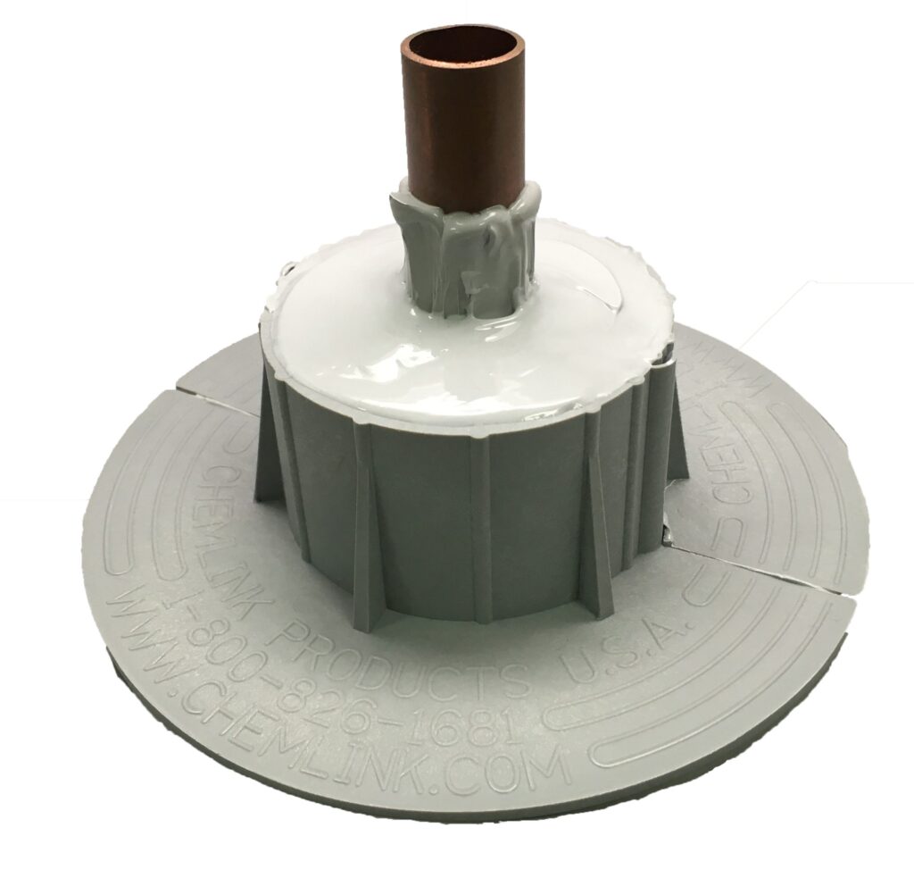 Hot Pipe E-Curb penetration seals replace old-style metal pitch pan roof installations with versatile, precast components and RTV silicone pourable sealants for installations requiring a service temperature between -80°F to 400°F (-62°C to 204°C). CHEM LINK’s Hot Pipe E-Curb System can usually be installed in under 15 minutes and never requires flashing or mechanical attachment. E-Curbs are designed for use on granulated modified bitumen, asphalt and coal tar B.U.R. (built up roofing). E-Curbs are specified for PVC, EPDM, PIB, and TPO single-ply roofing membranes. E-Curbs are highly versatile for sealing penetrations around HVAC, mechanical, solar panel mounts, electrical, and any type of structural supports and last longer than pitch pans with greater efficiency as well. TPO Primer is required for use with TPO single-ply roofing membrane.Hot Pipe E-Curb Penetration Seal System.