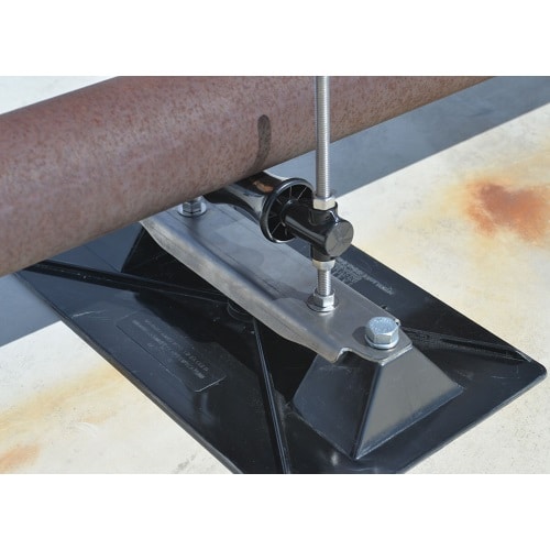 A “roller-bearing” pipe support used to support roof-mounted gas pipes, electrical conduit, solar piping and other mechanical piping. Unique design absorbs thermal expansion and contraction of pipes thus preventing damage to the roof membrane. Pipes rest on a self-lubricating polycarbonate resin roller rod and roller. The pipe support base is made of polycarbonate resin, the supporting all-thread and all metal parts are made of stainless steel. Pipestand will accommodate up to 4″ pipe (inside diameter) or up to 4 1/2″ (outside diameter) pipes.