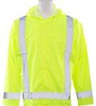 Ctn Qty 1. ANSI 107 Class 3 Rain Jacket. Polyester woven oxford with PU coating. 5.5mm. Snap front and wrist closure. Attached hood. Oversized. No pockets. M/L – 5X/6X