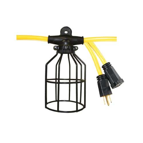 This Voltec light string is made with Heavy-Duty molded 150Watt sockets which are spaced out every ten feet. This string has a pre-assembled Metal cage which will save you time as well as cost of installation.